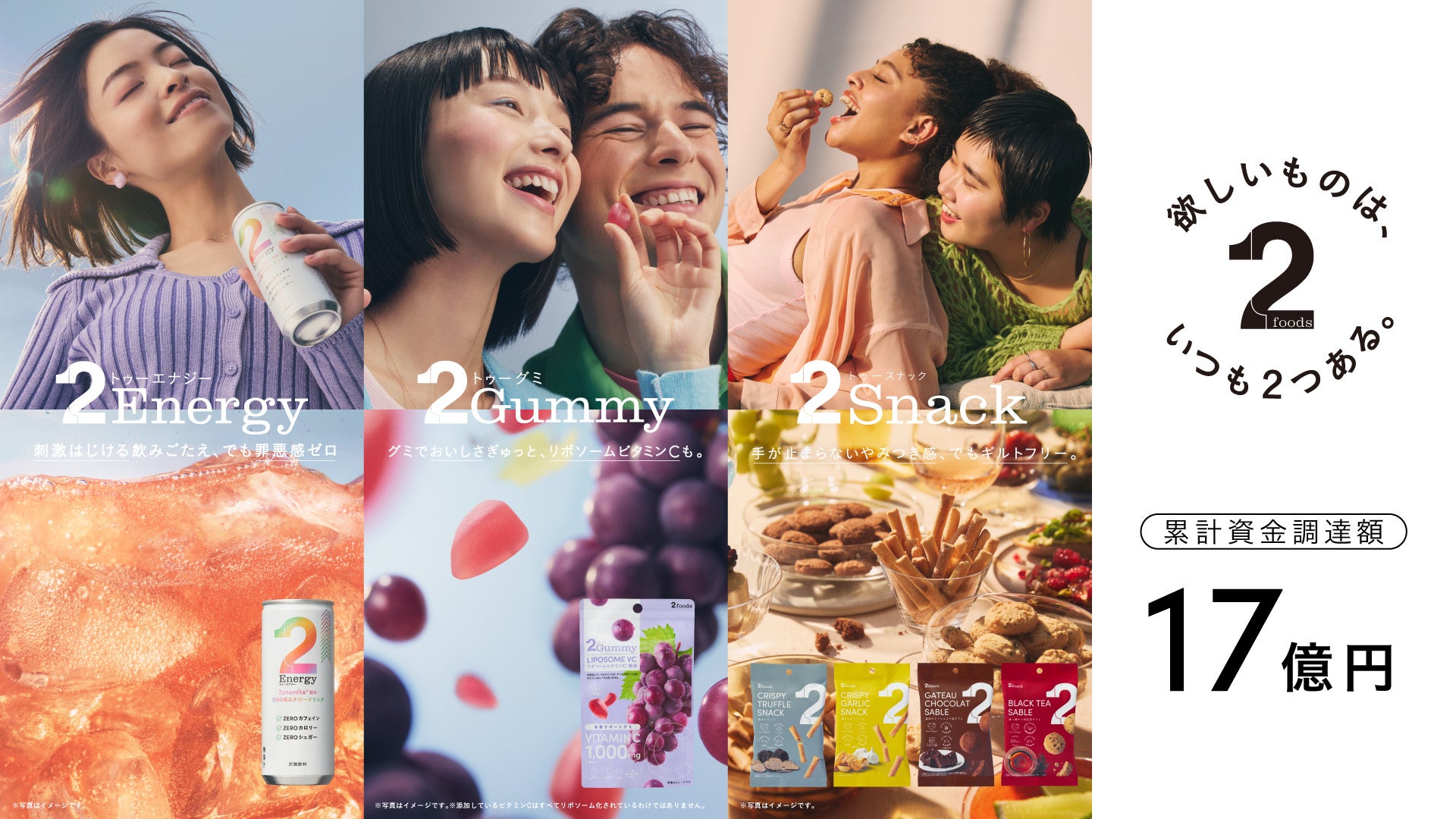 同社の代表商品には、日本初のリポソームビタミンCを配合したグミ「2Gummy LIPOSOME VC」、カフェイン量に着目したゼロカフェインエナジードリンク「2Energy」、やみつきになるおいしさとギルトフリーを両立したスナック「2Snack」などがあります。今回調達した資金は主に、「2foods」のブランディング、既存商品拡販のためのマーケティング、新商品開発など、さらなる事業展開を加速していくために充当する予定です。