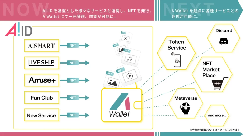 「A Wallet」とはデジタル資産としてのNFTを保有できるサービスのことで、アミューズが運営するオンラインショップやファンクラブなどと連携して使えます。