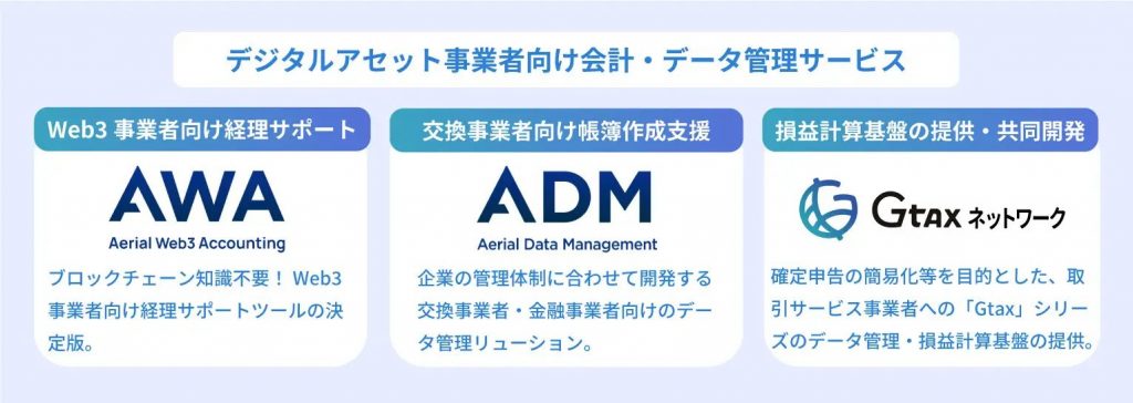 代表的なサービスとして、暗号資産の損益計算を簡単に行える「Gtax」シリーズがあり、個人や法人、税理士向けに幅広く対応しています。また、デジタルアセットを扱う事業者に向けた会計・データ管理の支援ツール「Aerial」シリーズも提供し、利用者が複雑な会計処理をよりスムーズに行える環境の整備を行なっています。