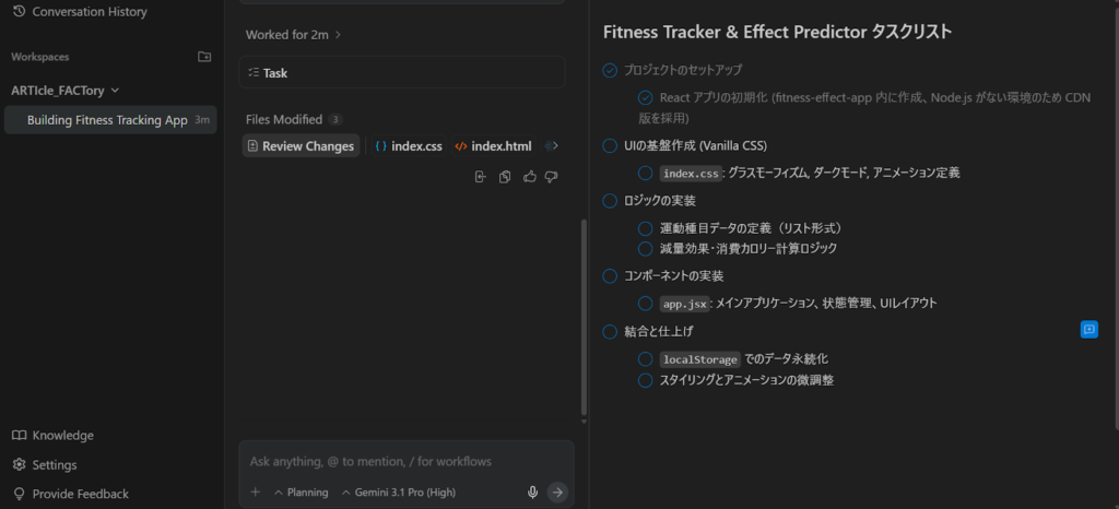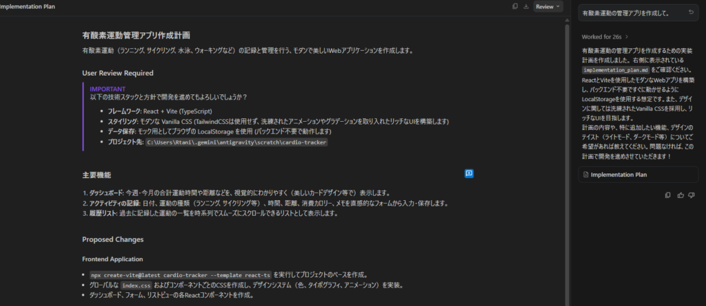人間の役割は「何を作りたいか」を伝え、結果をレビューすることだ。プログラミングの知識がなくても、アプリ開発に取り組める。これがAntigravityの最大の特徴である。
