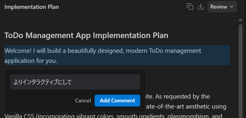 エージェントに仕事を任せるとき、一番の不安は「本当にちゃんと動いているのか」という点だろう。Antigravityはこの問題をアーティファクトで解決している。アーティファクトとは、エージェントが作業過程で生成する、タスクリスト、実行計画、スクリーンショット、ブラウザ録画といった成果物のことだ。これらにGoogle Docsのようにコメントを書き込め、エージェントの作業を止めずに修正指示を伝えられる。
