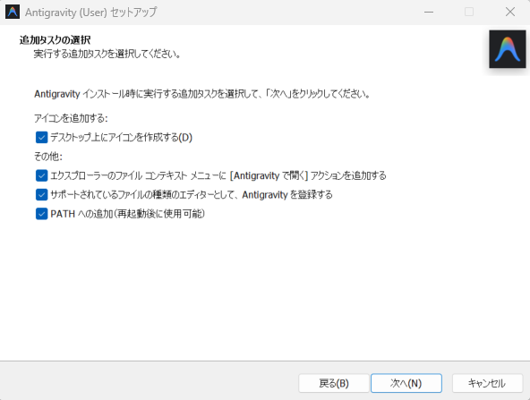 ダウンロードしたファイルを実行し、画面の指示に従って進める。Windowsの場合は「エクスプローラーのコンテキストメニューに[Antigravity で開く]を追加」にチェックを入れておくと便利だ。