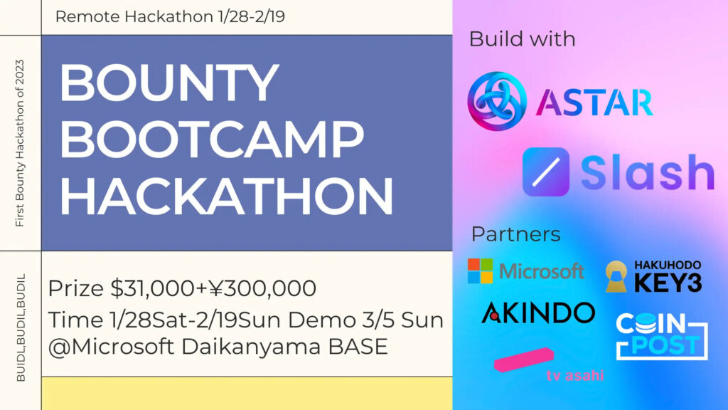 日本を代表するweb3プロジェクトであるAstarとSlashの開発を通して、ブロックチェーン開発のオンボーディングを支援するブロックチェーン開発初心者向けのハッカソンイベントです。マイクロソフトやテレビ朝日もスポンサーになるなど、こちらも大規模で開催されています。