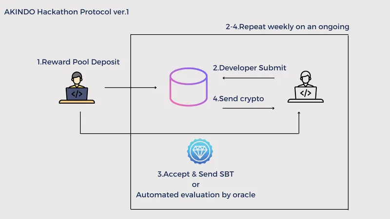 すごく簡単に言えば、ハッカソンを開催したいときにデポジットにプールし、そこに開発者が開発成果物を持って参加します。開発成果物はオラクルを通して参照、承認され、優良な開発者には投票権となるSBTが配布されます。そのSBTは成果物を提出した証明になると共に、今後の成果物を評価する投票にも参加することが可能となります。
