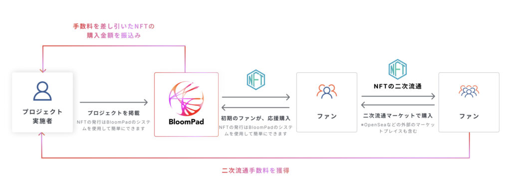 プロジェクト実施者がBloomPadへプロジェクトを掲載し、BloomPad上でファンが応援購入し、その後、NFTを保有しているファンがNFTを売りに出すことで他のファンが二次流通マーケットで購入することができます。