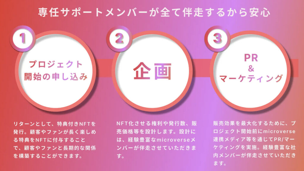 NFT化させる権利や発行数、 販売価格等を設計します。 設計には、経験豊富な microverse メンバーが伴走するとのことでございます。