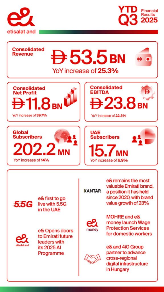 e&、2025年第3四半期も堅調な成長を維持し、連結売上高は29.2%増の186億ディルハムに