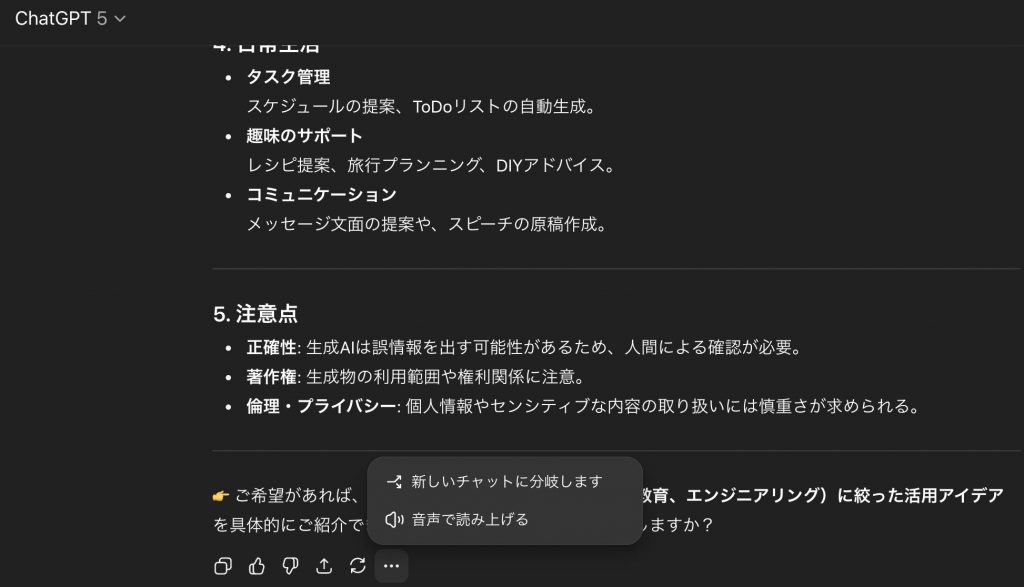 たとえば、元の会話では日本国内の実際の企業の生成AIの活用事例をリサーチし、新たなブランチでは生成AIの活用方法の注意点をもっと深掘りするなどができ、画面を分けて効率的にそれぞれのテーマを深掘りすることができます。