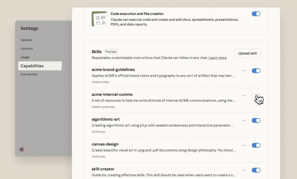 「Skills」の真価は、組織が日常的に使用している内部ツールやAPI、データベースとシームレスに連携できる点にあります。Claudeは、ユーザーから教わったスキルを実行する際、これらの外部ツールを自律的に呼び出して必要な情報を取得したり、データの更新を行ったりします。例えば、「最新の顧客データをCRMから抽出し、売上上位10社をリストアップする」といったスキルを教えれば、ClaudeはCRMのAPIを叩いて情報を取得し、結果を整形して提示します。これにより、AIの活用範囲は単なる文章作成や情報検索に留まらず、実際の業務アクションを伴うダイナミックなタスクへと大きく広がります。企業のワークフローに深く根差した、真に実践的なAI活用が実現するのです。