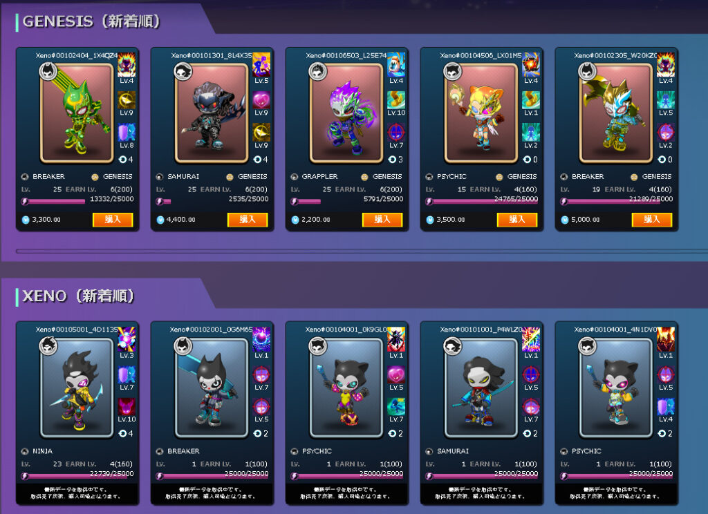 PROJECT XENOのマーケットプレイス(取引中のXENO一部)