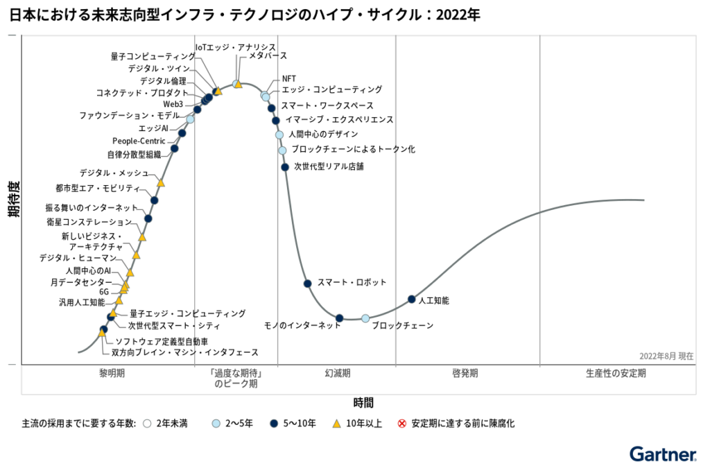 2023年8月に「日本における未来志向型インフラ・テクノロジのハイプ・サイクル」が発表されましたので2022年との比較と共に具体的に見ていきましょう。