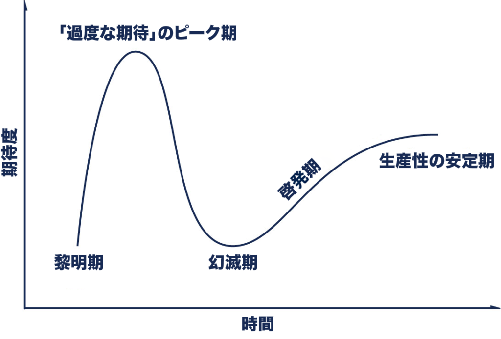 ハイプサイクルとは、横軸に時間、縦軸を期待度をとし、テクノロジーが登場した後の動きを黎明期、過度な期待のピーク期、幻滅期、啓発期、生産性の安定期に分類し、視覚的に説明するものです。