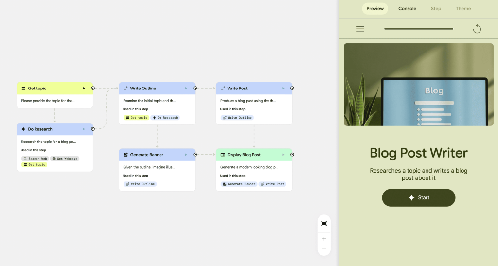 Opalは、専門的なコーディングを必要とせず、まるで図を描くような直感的な操作で、複雑なAIの動作手順(ワークフロー)を構築できる画期的なツールです。公式サイトの情報によれば、ユーザーは「キャンバス」と呼ばれる白い画面上で、GeminiをはじめとするAIモデル、社内のデータソース、そして「このような場合はこう動け」といった指示(プロンプト)といった様々な要素をブロックのように配置し、それらを線でつなぎ合わせるだけで、独自のAIアプリケーションを開発できるとされています。これまで開発者にしかできなかったAIサービスのプロトタイピングや実装を、企画担当者や現場の業務担当者自身の手で行えるようになる可能性を秘めています。Opalは、AI開発の専門性を一部の人間の手から解放し、組織全体の創造性を解き放つための、まさに「AI開発の民主化」を推し進めるための戦略的な一手と言えるでしょう。