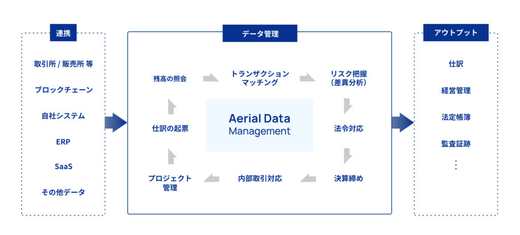 次に、ADM(Aerial Data Management)ですが、基本的には暗号資産取引事業者をクライアントとして、会計に必要なデータを一元管理し、そのデータを会計システムに適した形式に書き換えてアウトプットするシステムを提供する事業です。お客様となる企業の管理体制等を詳しくお伺いし、企業ごとに必要な機能が含まれるよう、柔軟にカスタマイズを行なった上で管理システムを開発・提供しています。