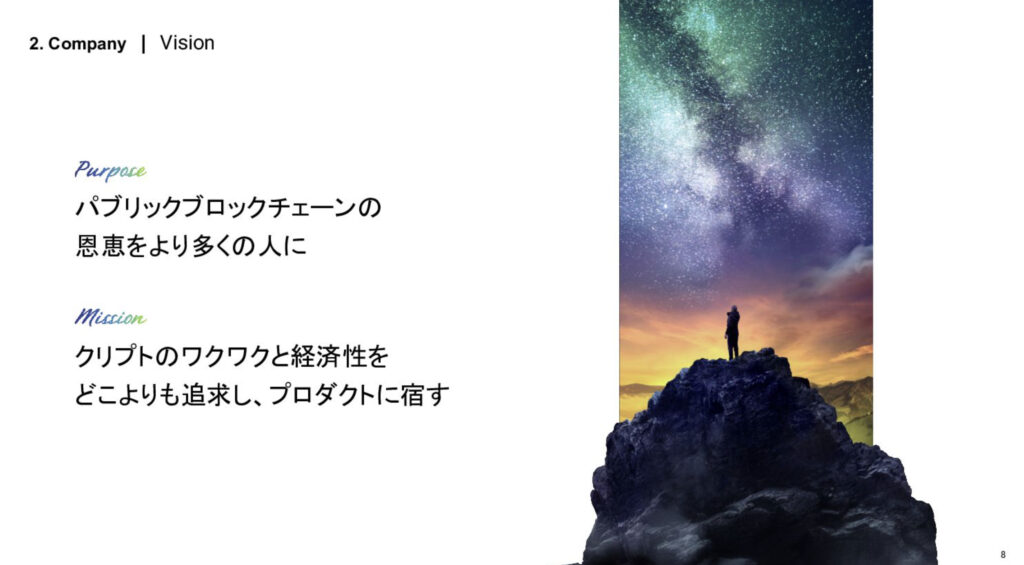 私達は昨年8月にビジョンを刷新して、パーパスとしては「パブリックブロックチェーンの恩恵をより多くの人に」というものを新しく掲げました。