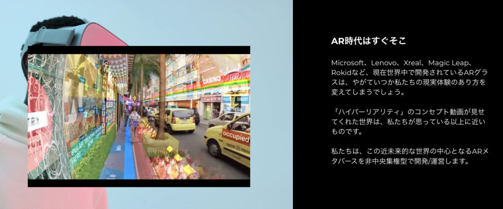 また、ARオブジェクトの所有権をNFTで管理しており、一般的なARプラットフォームとは異なり非中央集権的なARプラットフォームとなっています。
