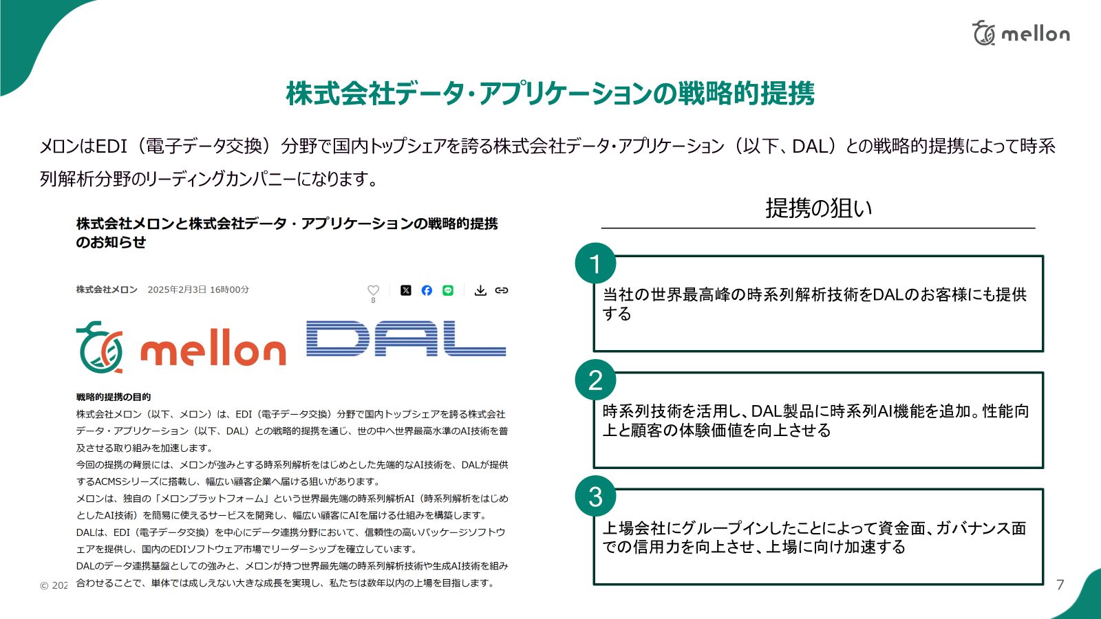 2つ目は、「メロンプラットフォーム」の機能拡充と普及です。先日発表したデータ・アプリケーション社との提携を皮切りに、様々なソフトウェアやクラウドサービスとの連携を進め、時系列解析AIの導入ハードルを下げていきます。