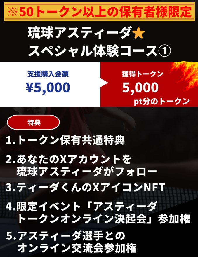早川:「モノよりコト体験を掲げ、アスティーダトークンを保有することで様々なユニークな体験を提供しています。例えば、琉球アスティーダの公式Xからフォローされたり、ティーダくんのアイコンNFTのプレゼントなどがあり、5,000円からこのような体験を得ることができます。」
