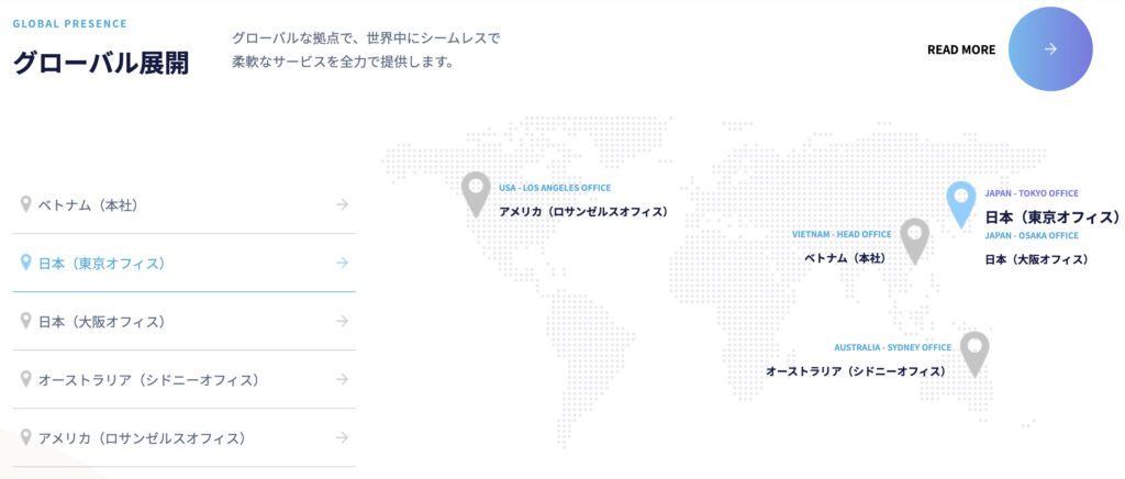 Web3以外につきましても海外28ヶ国で開発実績があります。アメリカ、オーストラリア、韓国、ヨーロッパ各国で法人を設立し、ベトナム国内の最先端技術を扱う約1,200人のエンジニアと連携し開発を行っています。具体的には、ホームページ制作やグラフィック開発、大手フードデリバリーサービスの大規模サービスアプリケーション開発なども対応しております。