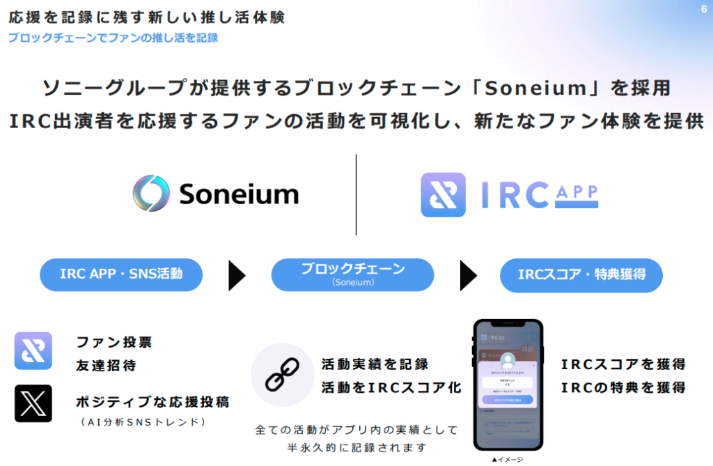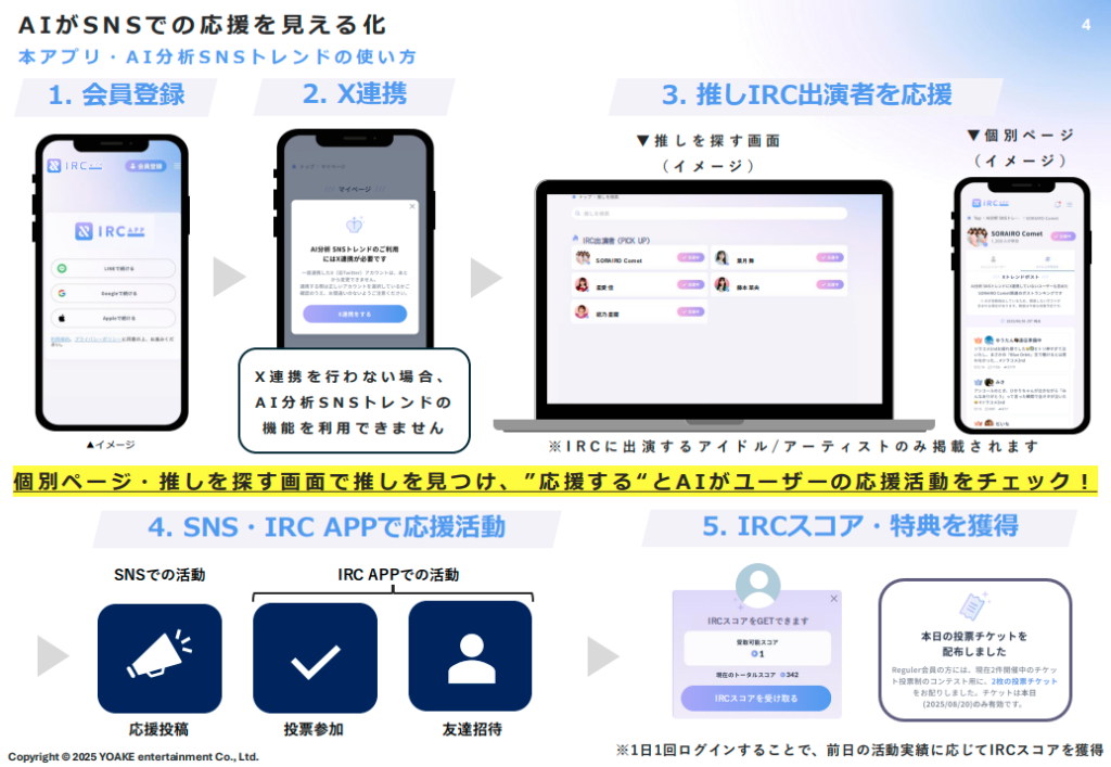 IRC APPの最大の特徴は、「AIがSNSでの応援を見える化」することです。ユーザーがアプリをXアカウントと連携して出演者へのポジティブな応援投稿をすると、AIがその熱量や前向きな情報を分析し、実績として「IRCスコア」を付与します。
