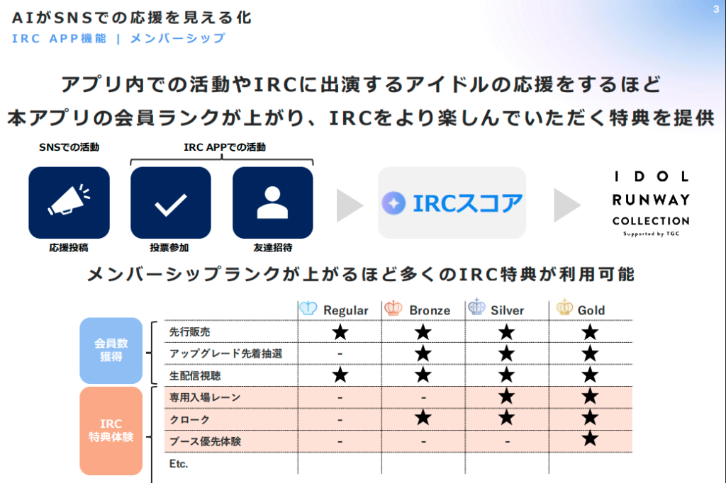最も分かりやすい体験が、「IRCスコアに連動したメンバーシップ特典」です。継続的でポジティブな応援投稿をすればするほど、アプリ内の会員ランクがRegularからBronze、Silver、Goldへと上がり、ランクに応じた特典が解放されていく仕組みです。具体的には、イベントチケットの先行販売やアップグレード先着抽選への参加権、専用入場レーンの利用、さらにはブースの優先体験といった、IRCイベントをより深く楽しめる体験が用意されています。つまり、日頃からSNSで熱心に推しを応援し、プラットフォームやIPに貢献しているファンほど、イベント当日により充実した特別な体験を得られるのです。