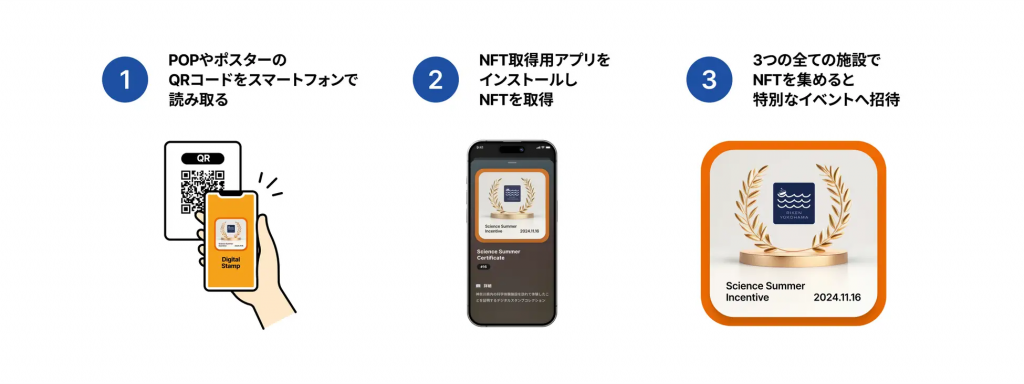 NFTは、2024年8月1日(木)から10月15日(火)の期間中、神奈川県内の3つの施設で取得できます。また、すべてのNFTを集めた参加者を、抽選で、同年11月16日(土)の理化学研究所 横浜キャンパス一般公開にあわせて実施する特別なイベントへ招待します。