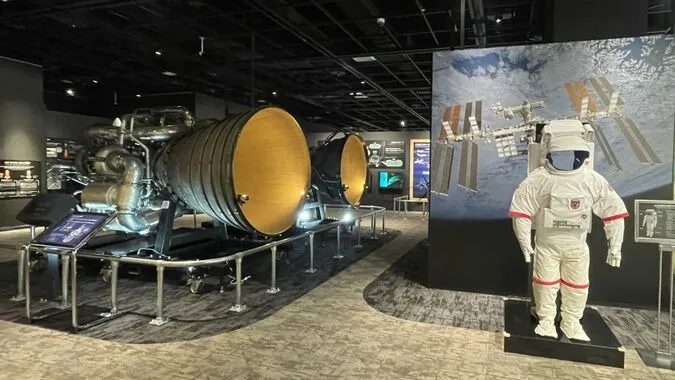 ロケットエンジンの実物や深海調査船の大型模型をはじめ、電車や航空機などの乗り物の模型も多く展示されています。また、宇宙飛行士に求められる能力にチャレンジできるコーナーや、タッチパネルなど体験型展示も充実しています。2階のシアターでは全幅15メートルの円筒形大型スクリーンに、船やロケットなどのものづくりの工程や仕組みが映し出され、迫力ある映像を見ながら技術を体感することができます。