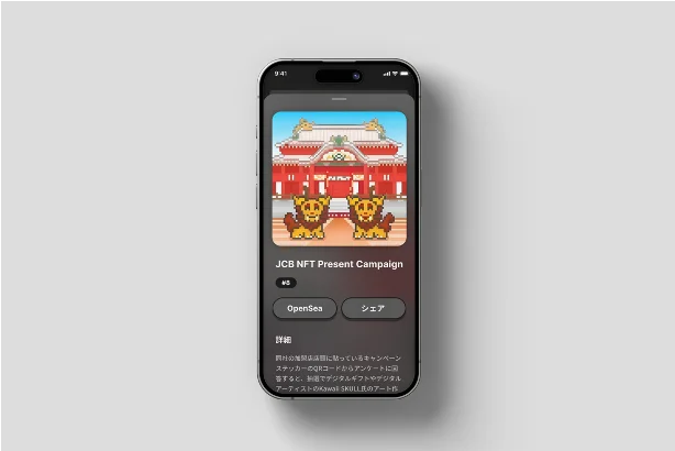 株式会社ジェーシービー(以下、JCB)が開始した、沖縄の加盟店を中心に実施する「NFTプレゼントキャンペーン」において、技術面での支援を行いました。JCBが実施している「JCBカードが使えるお店でラッキーチャンス!」キャンペーンを拡充したものであり、キャンペーン期間中に、同社の加盟店店頭に貼っているキャンペーンステッカーのQRコードからアンケートに回答すると、抽選でデジタルギフトやデジタルアーティストのKawaii SKULL氏のアート作品をモチーフにした限定NFTがプレゼントされるものです。また、本キャンペーンへの参加1回につき1円が、首里城未来基金(https://www.shurijo-fukkou.jp/)へ寄附されます。