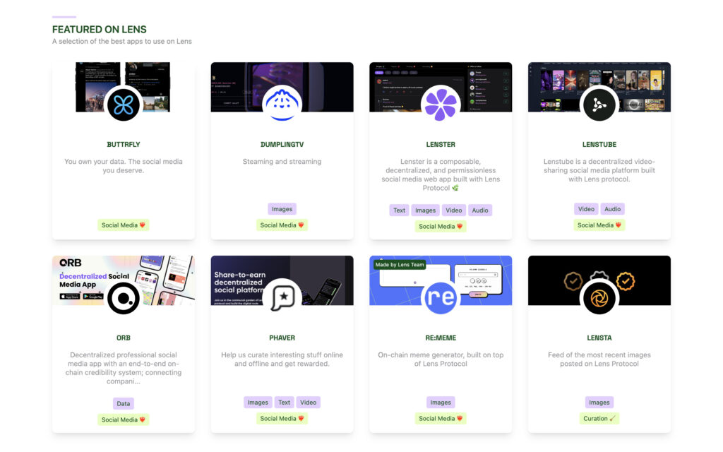 HP上にはLens Protocolで作られたアプリケーションが紹介されていますが、すでに100を超えるアプリケーションが誕生しているそうです。