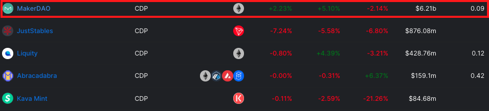 以下はCDP※のTVLが高いTOP5ですが、MakerDAOが圧倒的No.1であることがわかります。