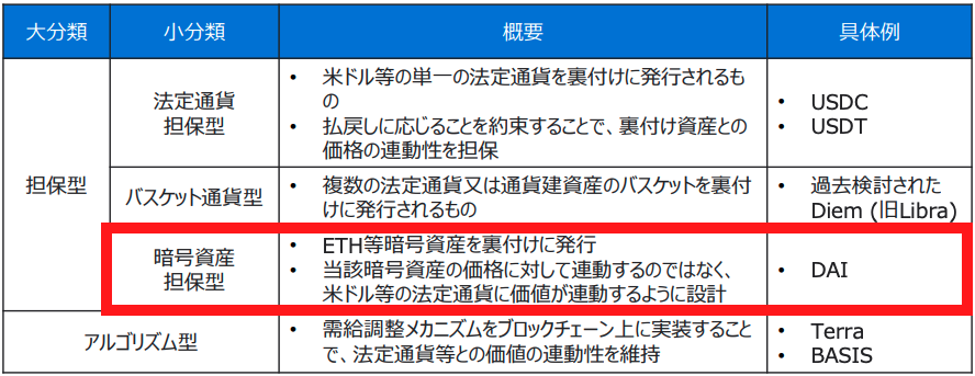 ステーブルコインには大きく4種類あり、 DAIは暗号資産担保型に分類されます。