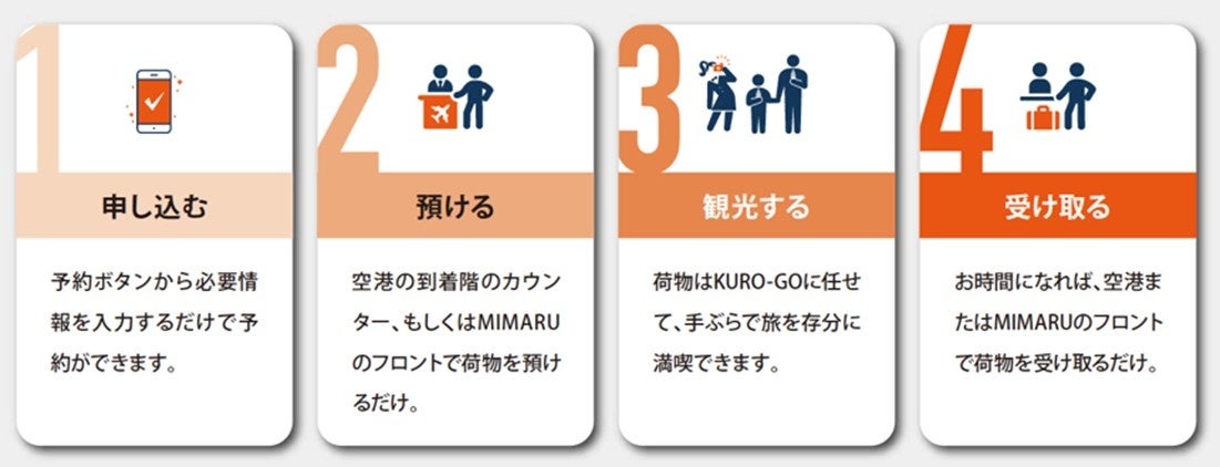 申し込みは「KURO-GO Luggage Delivery」サービスサイトで、必要な情報を入力するだけで完了します(対応言語は日本語、英語、中国語)。空港で手荷物を預ければ、滞在先の「MIMARU」まで配送され、帰国時には「MIMARU」から空港まで荷物をお届けします。大きな荷物を持ち運ぶことなく、空港と観光地を身軽に移動できるサービスを提供しています。