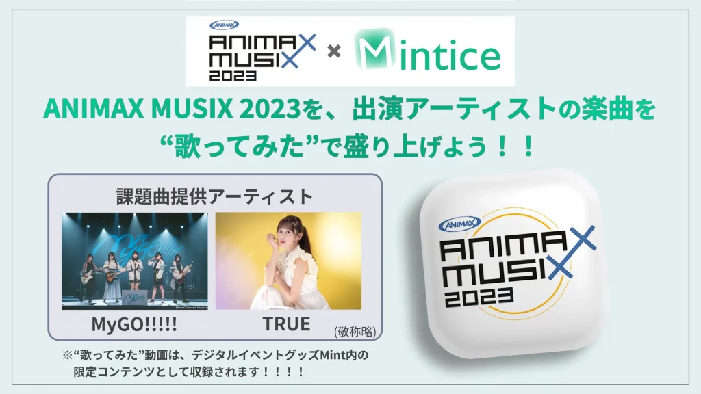 興行イベントやクリエイター向けの新たなデジタルグッズの販売プラットフォーム「Mintice」と、株式会社アニマックスブロードキャスト・ジャパンとの共同で『ANIMAX MUSIX 2023』を応援するデジタルグッズMint販売企画の課題曲として、すでに発表されているTRUEの『DREAM SOLISTER』と『アンサンブル』に加え、MyGO!!!!!の『迷路日々』と『迷星叫』が新たに追加されました。