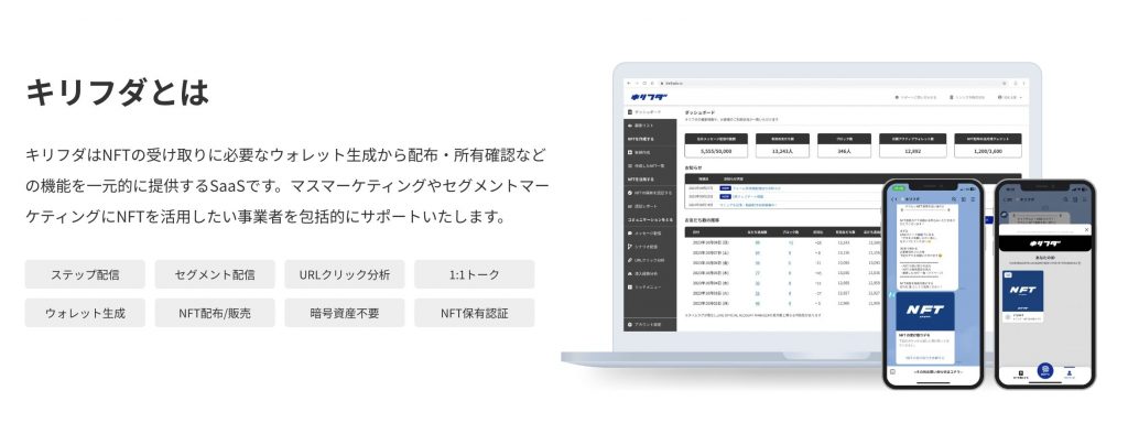 シンシズモ株式会社は、NFTの利用体験をより簡素化しユーザーのオンボーディングから継続利用までをサポートするサービスであるキリフダを提供しています。キリフダの特徴は下記となっています。