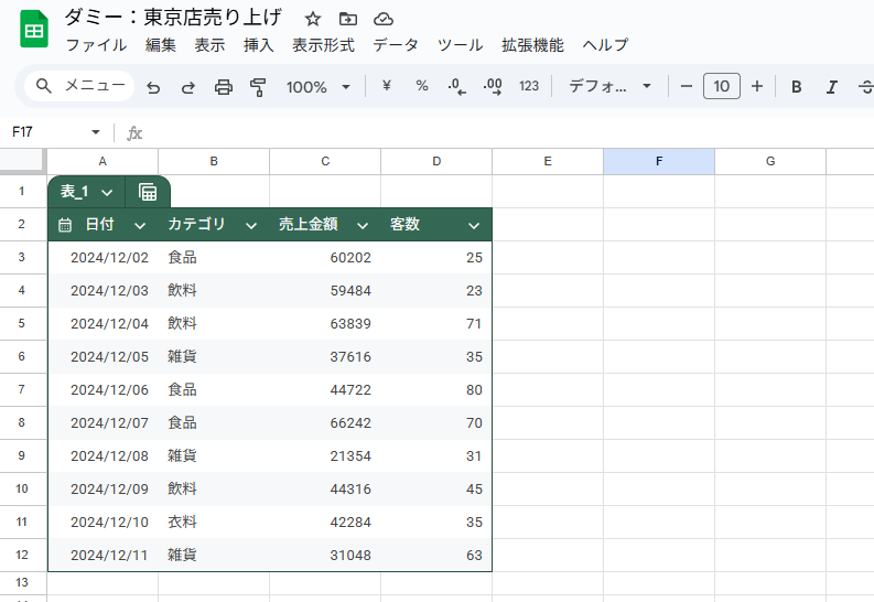 データソースとなるGoogleスプレッドシートには、店舗の異なる日付・カテゴリ・売上金額・客数の5項目を用意した。3店舗分、10日分のサンプルデータだ。