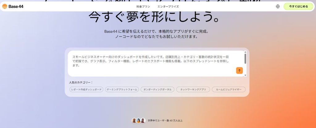BASE44のトップページにアクセスし、以下のプロンプトを入力した。