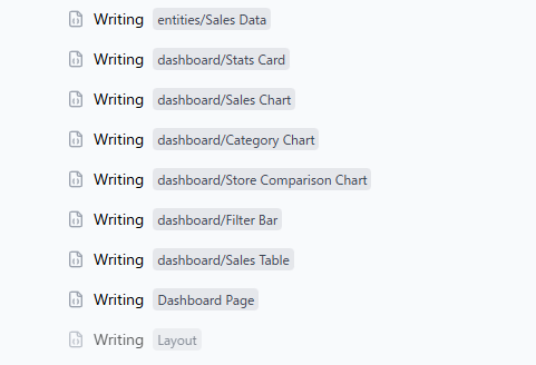 Sales Data、Stats Card、Sales Chart、Category Chart、Store Comparison Chart、Filter Bar、Sales Table、Dashboard Page、Layoutと、必要な要素が次々と自動生成されていく様子が確認できる。