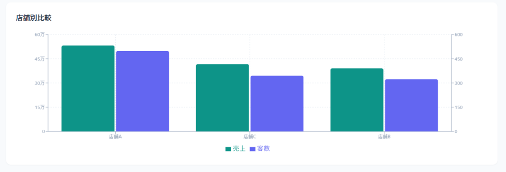 生成されたダッシュボードは、すでに店舗別比較チャートが機能していた。売上と客数を店舗ごとに棒グラフで比較できる。