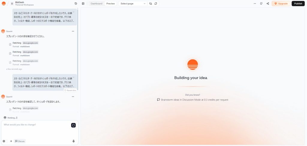 プロンプトとともにGoogleスプレッドシートのURLを貼り付けると、BASE44は即座にスプレッドシートのデータ構造を解析し始めた。