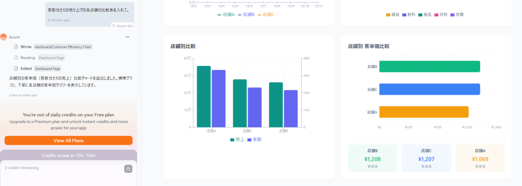 BASE44は数十秒で新しいコンポーネント(Customer Efficiency Chart)を生成し、ダッシュボードに追加した。横棒グラフで各店舗の客単価を比較表示し、下部には各店舗の客単価サマリーも表示される仕様だ。