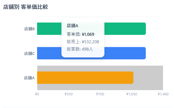 グラフにマウスオーバーすると、店舗Aの場合「客単価: ¥1,069、総売上: ¥532,208、総客数: 498人」といった詳細情報がツールチップで表示される。このようなインタラクティブな要素も自動で実装されていた。