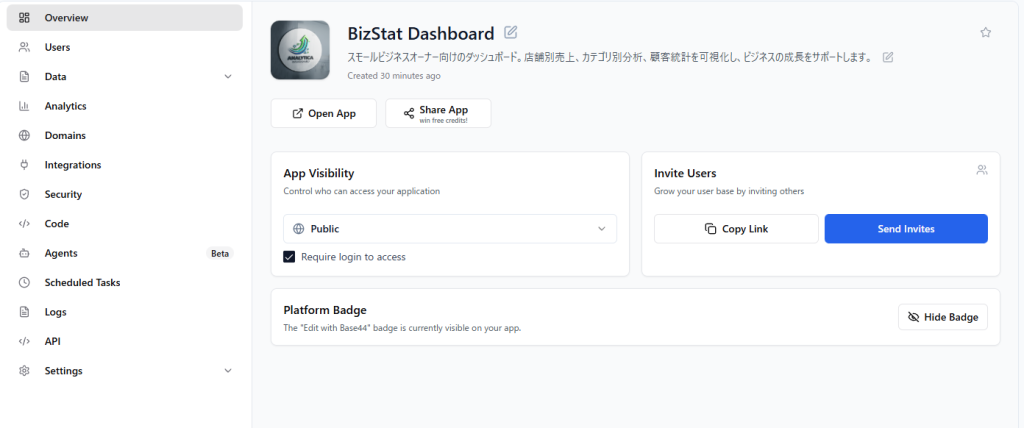 チームメンバーへの共有は「Copy Link」か「Send Invites」から行える。BASE44のドメイン(*.base44.app)でホスティングされるため、サーバー設定やドメイン取得の手間は一切不要だ。