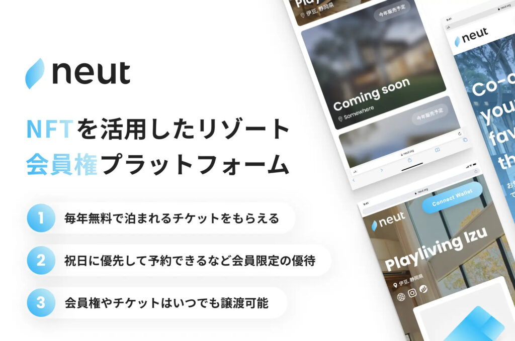 例えば、2023年1月18日にリリースされた「neut」というサービスは、NOT A HOTELのようにリゾートの会員権をNFTにして販売するプラットフォームです。