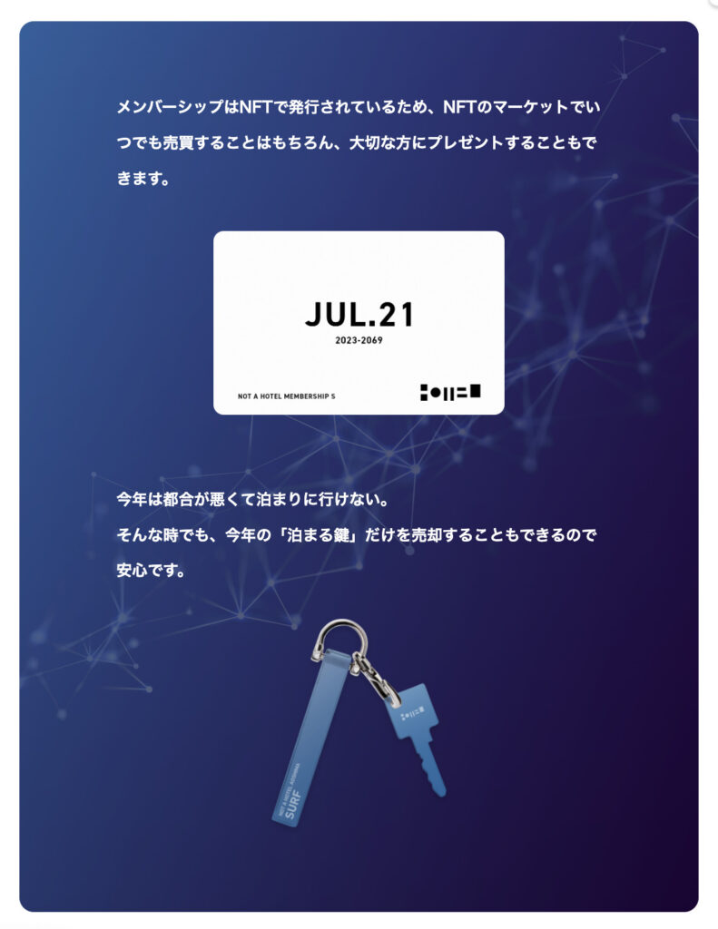 もちろんNFTなので、売買や譲渡も可能です。また、47年間分の宿泊券が付与されている”メンバーシップNFT”と毎年発行される建物に入るために必要な”キーNFT”が分かれているため、今年の分だけ(今年のキーNFT)を販売することも可能となっています。