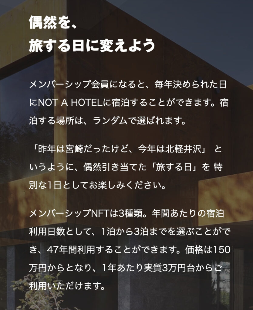 そんな「NOT A HOTEL」が2022年6月に「NOT A HOTEL メンバーシップNFT」を発表し、第一弾の販売は3億円が即完する盛り上がりを見せました。