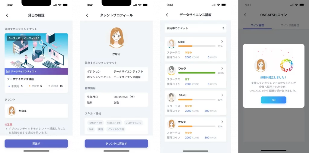 ONGAESHIの詳細について、タレントはスポンサーから講座の受講権を借り無償で学び転職することができ、アプリ上で簡単に利用することができます。また、学ぶほどにコインを獲得でき(「Learn to earn」機能:講座修了時点で1,500円相当のコインを獲得可能)、オンライン上にて集合研修やグループワークで、クラスメートと実践的に学ぶことができます。