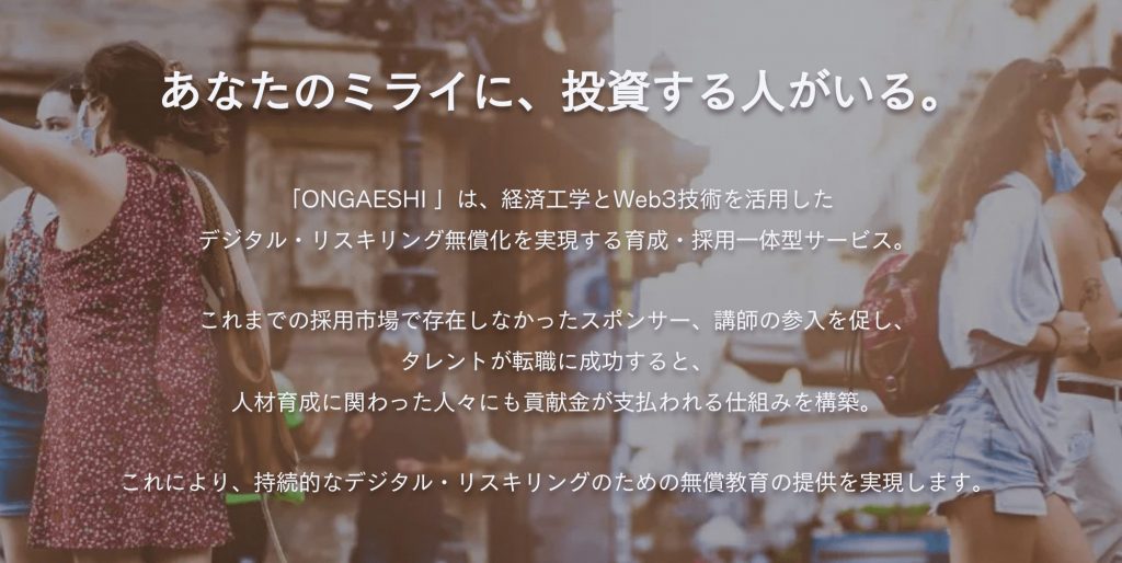 リスキリング・転職一体型サービス「ONGAESHI(オンガエシ)」は、教育格差の是正を目標として、ブロックチェーンを活用し「無償で学び転職を目指す人(タレント)」と「学びを支援したい人(スポンサー)」をマッチングすることで、「無償の学び」を持続可能な方法で提供するサービスです。無償で学んだタレントが転職に成功すると、スポンサーには人材育成の貢献の返礼としてトークンが付与されます。