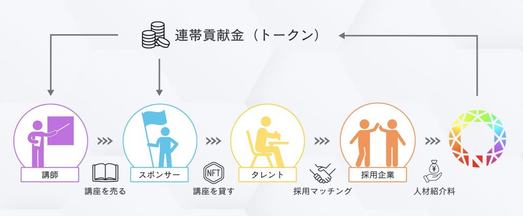 ここではONGAESHIに特徴的なスポンサーについて説明します。スポンサーは、学びたい人を支援し、教育支援の仕組みづくりに参加できる仕掛けであり、タレントの代わりに、「NFT化された講座の受講権」を購入し、支援したいタレントを選び、そのNFTを無償で貸し出すことで、タレントの「無償の学び」を実現することができます。その後、タレントが受講を修了し転職すると、人材育成への貢献金としてトークンを得られる仕組みとなっています。