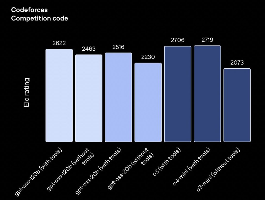 gpt-oss-120bは、特に高度なコーディングスキルが求められる競技プログラミング(Codeforces)において、OpenAIのo3-miniを明確に上回る結果を示しました。加えて、一般的な問題解決能力を測るMMLUやHLE、ツール活用スキルを評価するTauBenchといった指標でも、非常に高いスコアを記録しています。