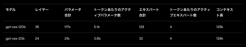 このモデルは「Mixture-of-Experts(MoE)」という仕組みを使っており、入力された内容に合わせて必要なパラメータ(モデル内の情報)だけを選んで使うことで、計算を効率化しています。gpt-oss-120bは1つのトークン(単語など)に対して約51億、gpt-oss-20bは約36億のパラメータを動かしています。全体のパラメータ数はそれぞれ1170億、210億に上ります。